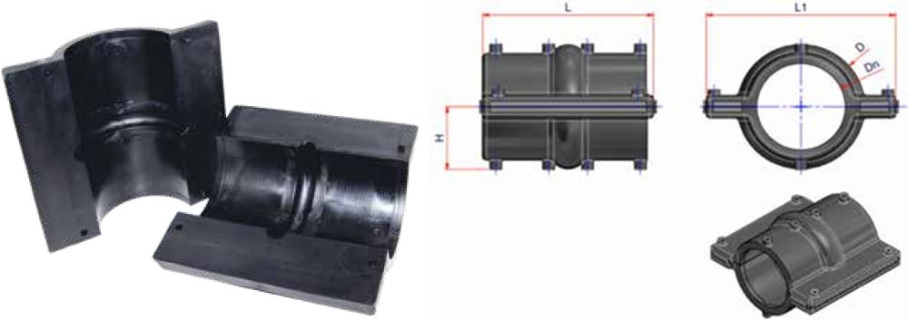 ПРМИД—модульная система полукруглых муфт с ЗН, которые могут устанавливаться и привариваться к ПЭ трубе для ремонта ее наружных несквозных протяженных осевых повреждений (царапины, вмятины, заусенцы и т.п.) глубиной до 30% от толщины стенки трубы. Внутренний диаметр ПРМИД также соответствует стандартным наружным диаметрам полиэтиленовых труб.