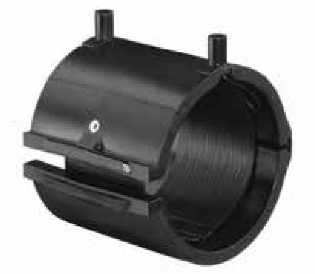 VIII. Усилительная муфта (УМ) («Георг Фишер»). «Георг Фишер» выпускала усилительные муфты хомутового типа с ЗН, выполненным отдельно от ее корпуса (Рис. 7), предназначавшиеся для усиления участков ПЭ трубы с несквозными повреждениями, а также испытавших пластическую деформацию при передавливании. Перед приваркой такая УМ фиксируется специальным зажимом.