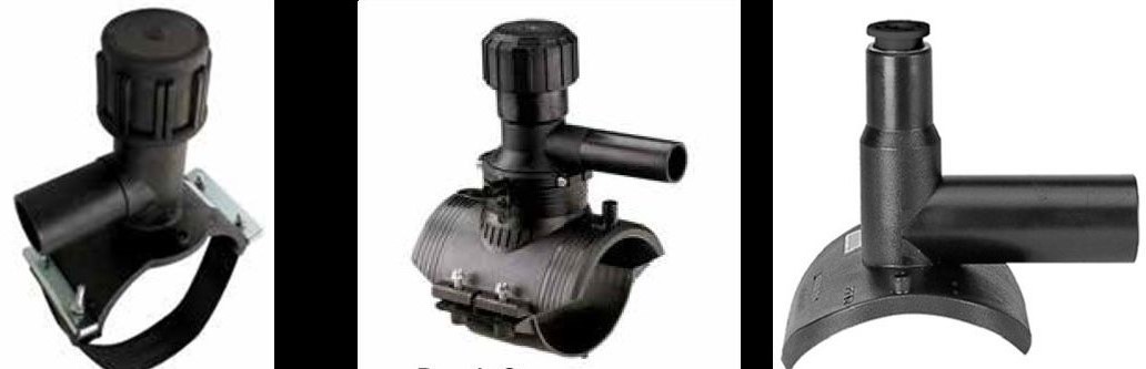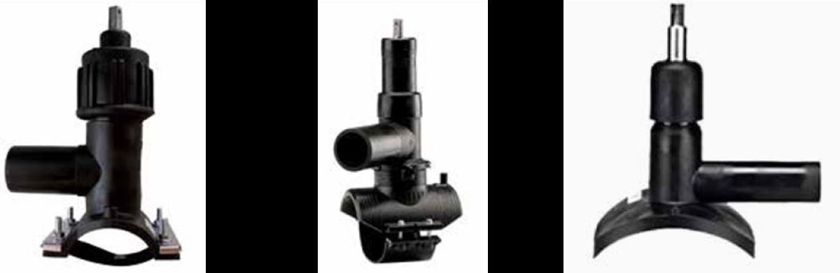 Вентили для врезки под давлением— полиэтиленовый фитинг с ЗН в виде седловидной накладки с патрубком ответвлением и вмонтированным в головку фрезой и запорным устройством. В основном используется для врезки в действующий трубопровод. Запорное устройство позволяет перекрывать поток транспортируемой среды после вывода телескопического удлинителя в футляре под ковер или люк. Управляются специальным трубчатым накидным ключом квадратного сечения. Назначение, способ монтажа, опрессовка приваренной детали и порядок прорезания аналогичны седловому отводу. Максимальный диаметр патрубка у всех моделей также не превышает 63 мм.