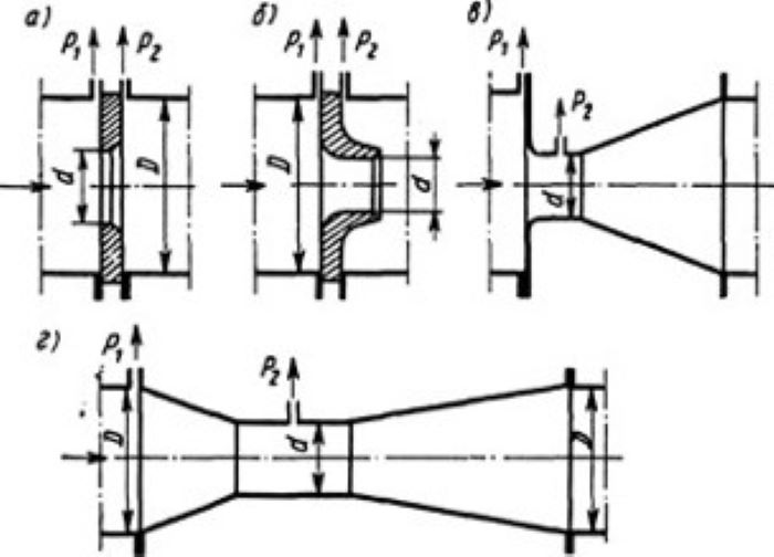 Рис. 5. Некоторые виды сужающих устройств на газопроводе. а диафрагма; б – сопло; в – сопло Вентури; г – трубка Вентури