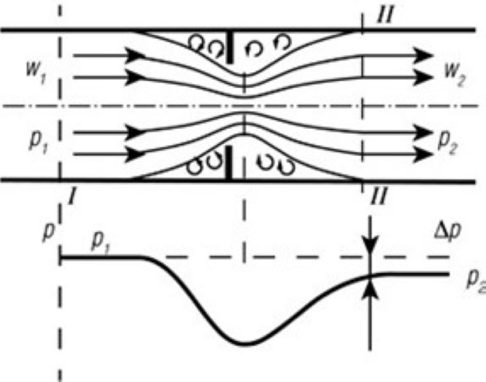 При прохождении газа через седловой отвод, который представляет собой местное сужение, происходит его дросселирование, т.е. снижение давления газа без совершения им механической работы. При подходе к прорезанному фрезой отверстию поток газа, сужаясь, разгоняется, давление внутри него уменьшается, а на стенке трубопровода вследствие торможения газа в застойной зоне оно несколько повышается. После прохождения отверстия поток, расширяясь до стенок трубопровода, тормозится, давление газа при этом возрастает. Однако давление Р2 после сужения оказывается меньше давления Р1 перед сужением [2]. Снижение давления является следствием потерь на трение и вихреобразование, вызванное разностью давлений (рис. 3).