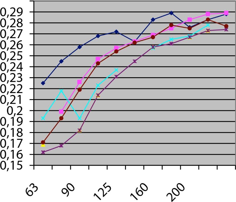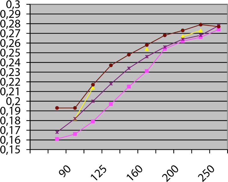 Для патрубков — отводов диаметром 50 и 63 мм наименьшее относительное падение давления газа наблюдается у седловых отводов марки «Элофит». Для них относительное падение давления газа на диаметре основного трубопровода 90 мм примерно на 15% меньше, чем для седловых отводов марки «Евростандарт». Однако, как и в предыдущем случае, с увеличением диаметра основного трубопровода до 250 мм и выше показатели относительного падения давления газа всех производителей возрастают и становятся близки по значению, в диапазоне 0,26–0,28.