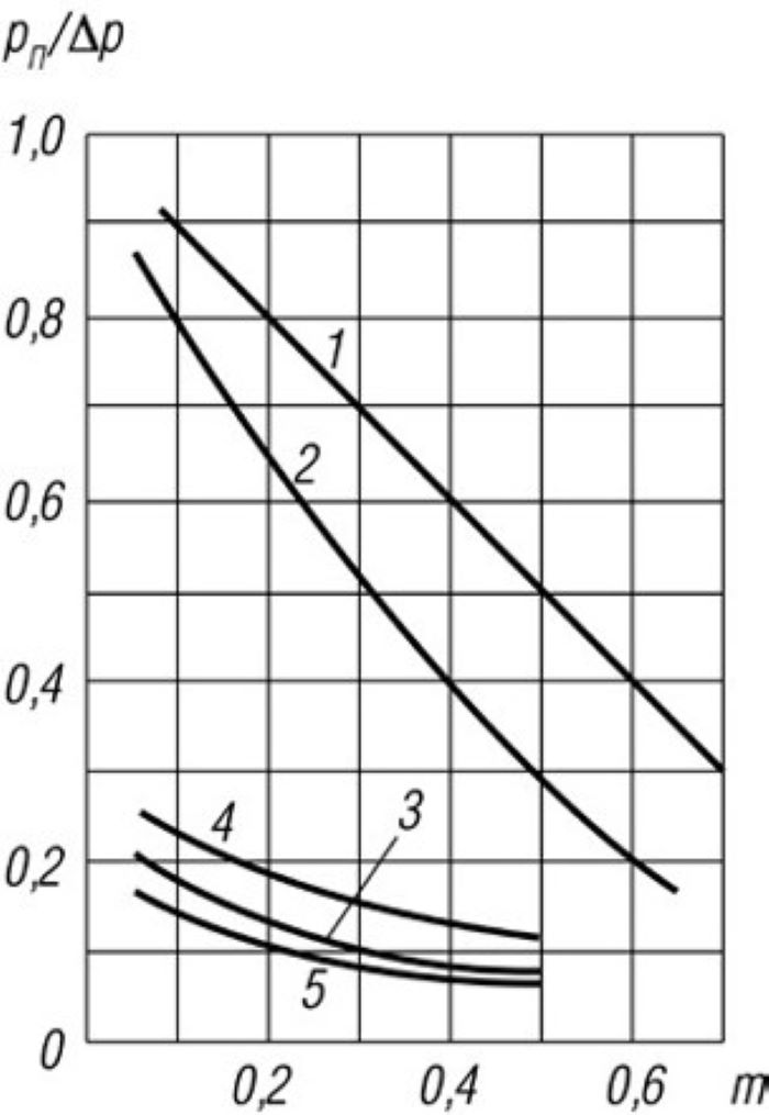 Рис. 6. Зависимость относительного перепада давления потока газа от соотношения сечений на сужениях разной формы. 1 диафрагма; 2 сопло; 3, 4, 5 – сопла Вентури различных конструкций. Обозначения: Pn = DР = Р1 – Р2 потеря давления в сужающем устройстве; ΔP = Р1 – Р2min – перепад давления; m = d²/D² модуль сужающего устройства; D – внутренний диаметр трубопровода перед сужением; d – диаметр отверстия сужающего устройства.