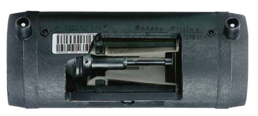 Помимо устройств, устанавливаемых на газопроводах в процессе строительства, применяются устройства защиты существующих вводов (УЗСО, Рис. 5), схожие по конструкции с СОКО и ПКО, которые защищают уже эксплуатируемые газопроводы — отводы. Они устанавливаются как можно ближе к месту подключения через кран, находящийся в шкафу с газорегулирующим устройством. Для их установки не требуется проведение земляных работ (Рис. 6). Установка УЗСО осуществляется от вновь установленного или уже действующего кранового узла, находящегося на фасаде здания. Ввод и фиксация устройства проводится специальным зондом по определенной методике.